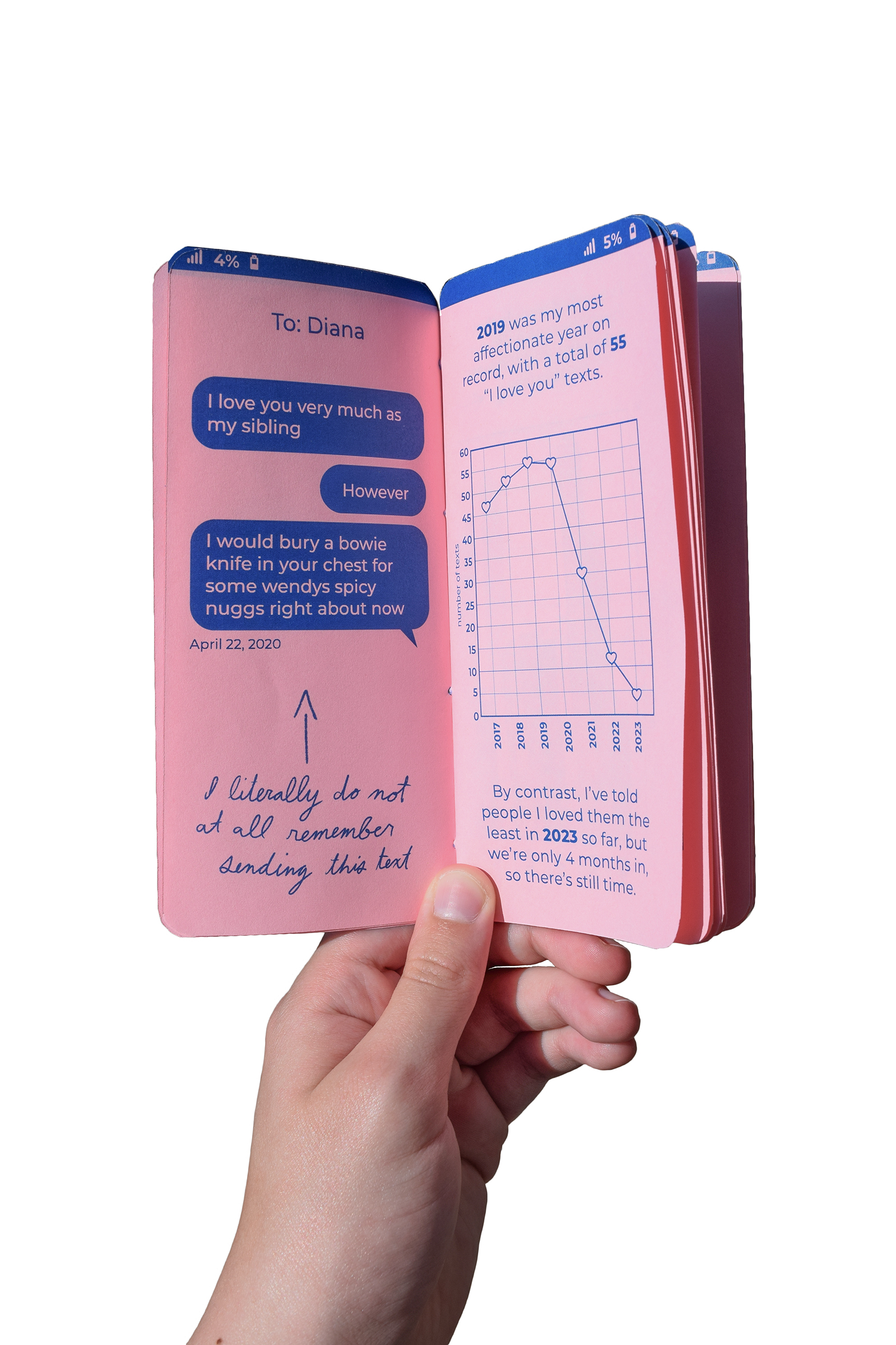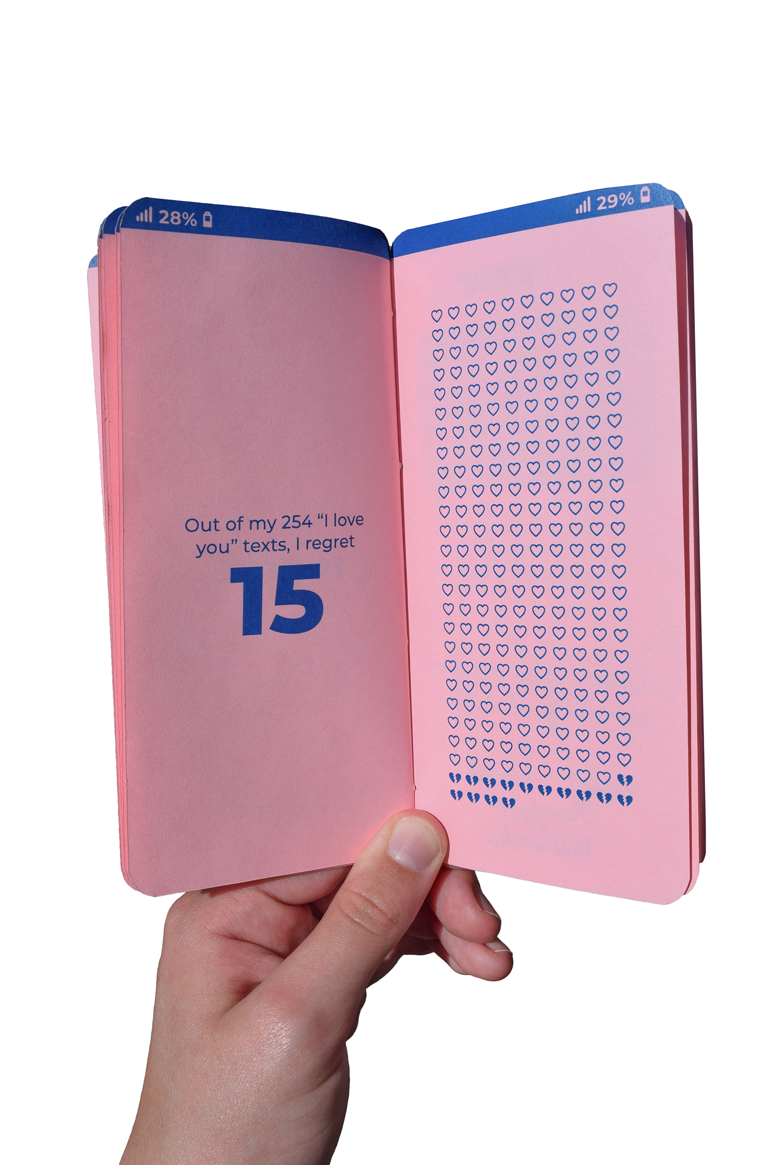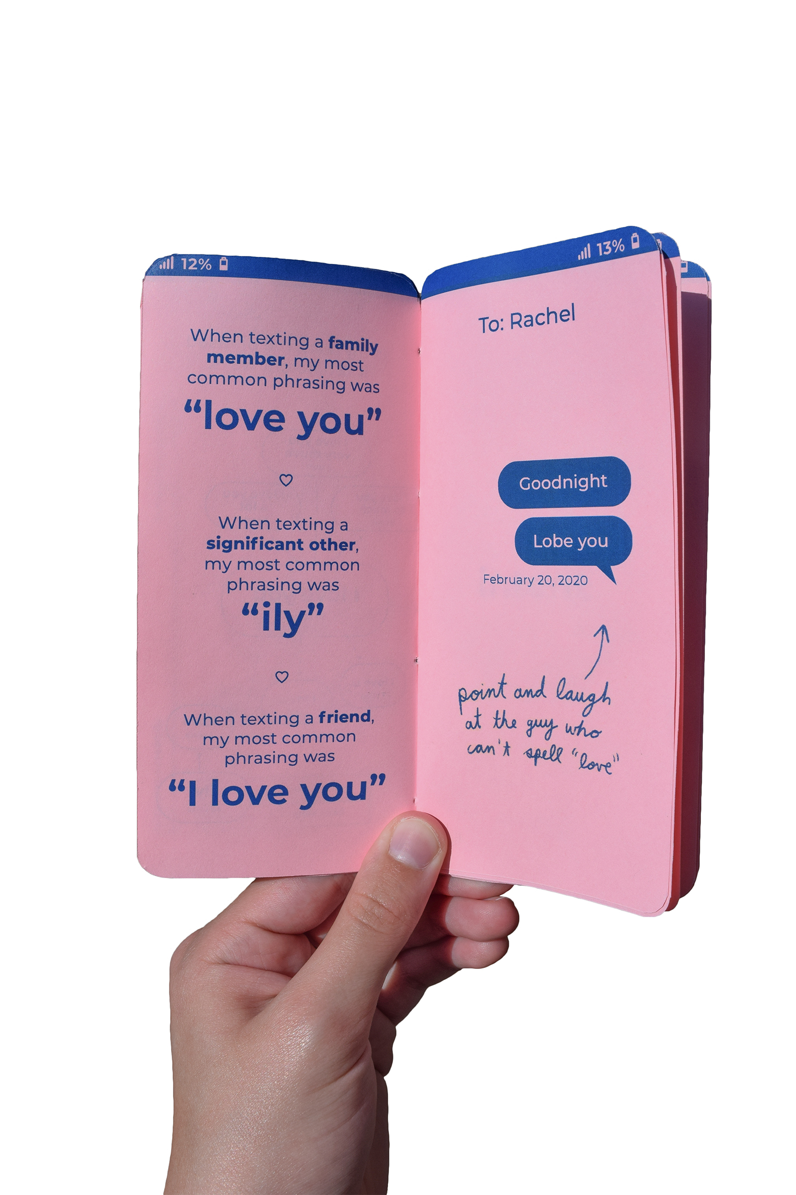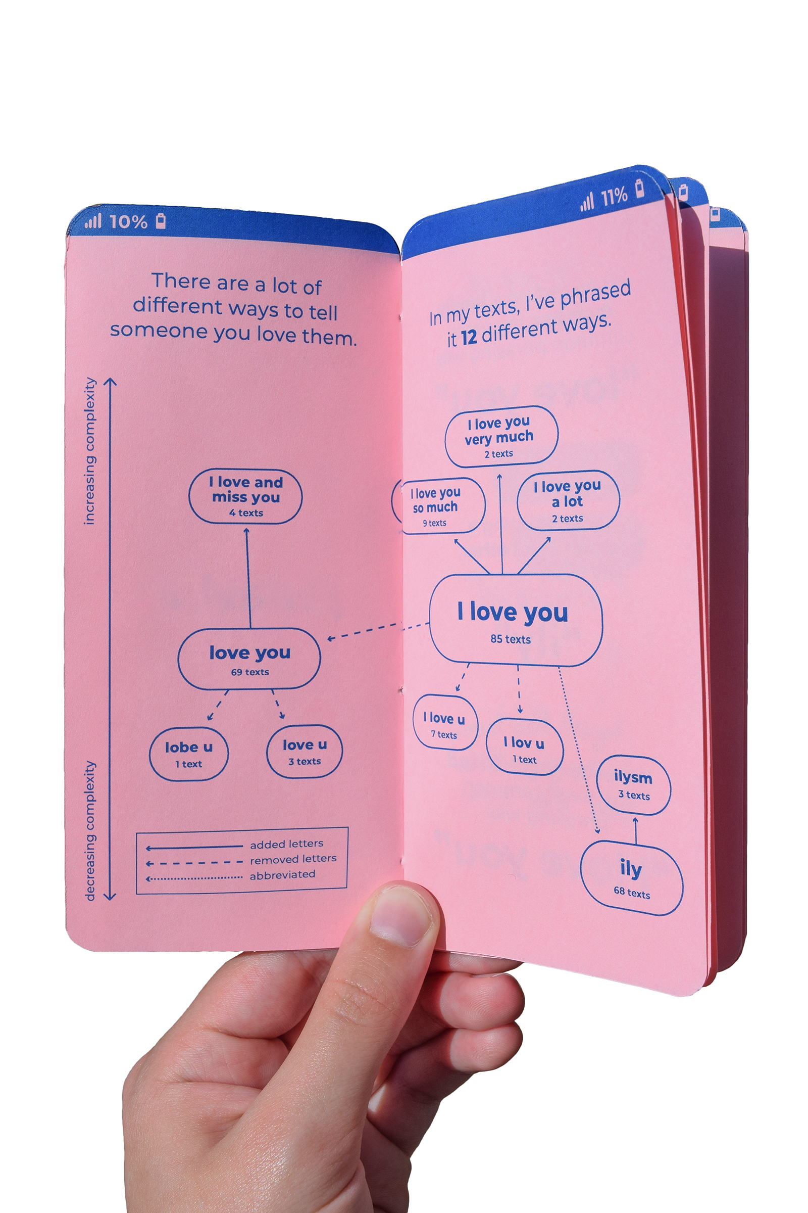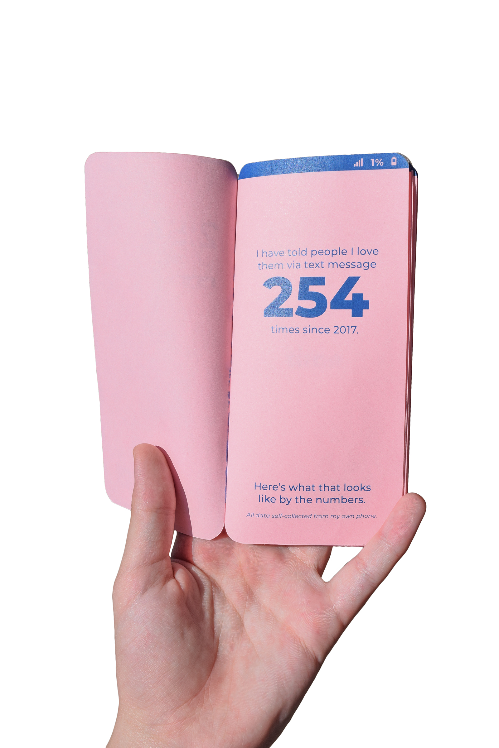 254 'I Love You's This is a phone-sized zine in which I catalogued and visually represented data about all 254 times in my phone's message history that I texted anyone any variation of "I love you".