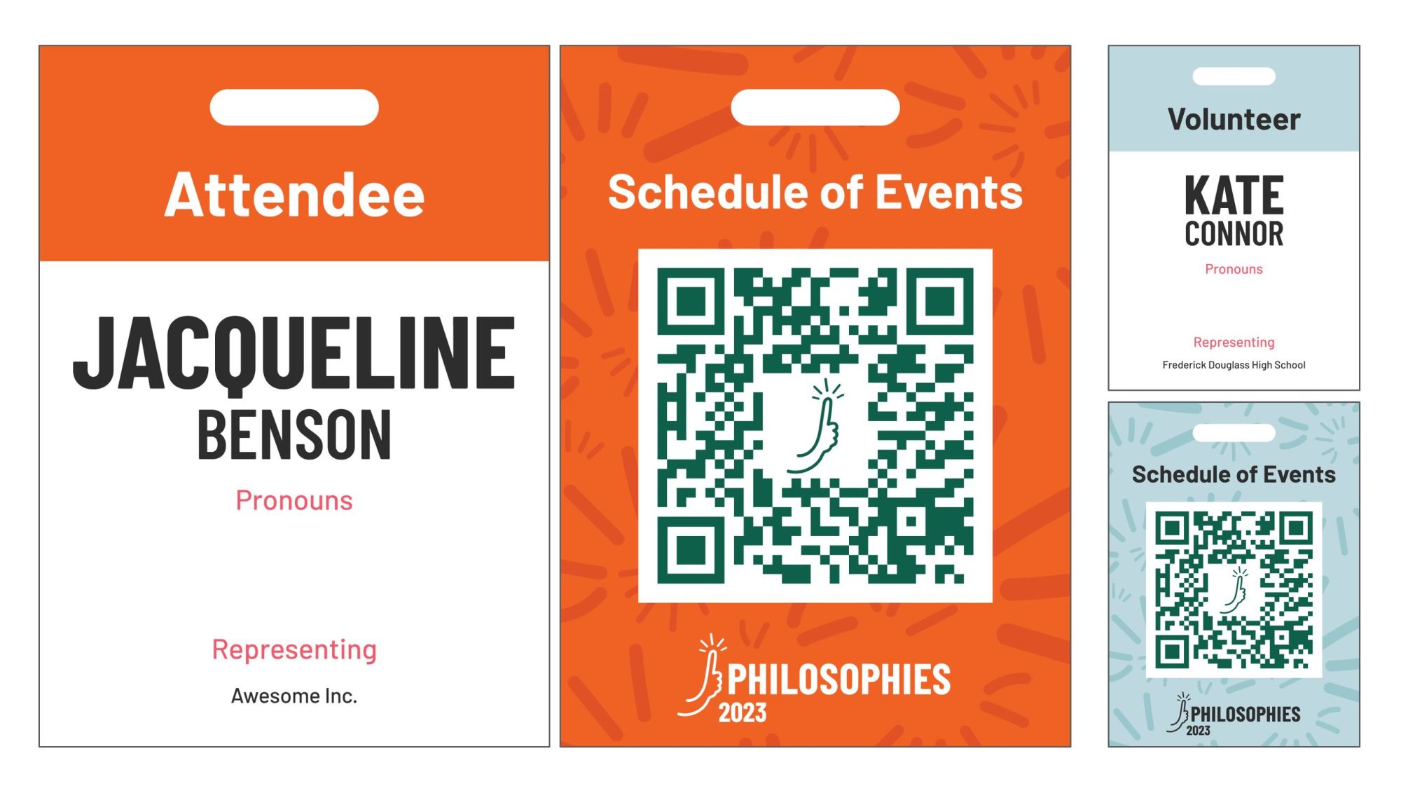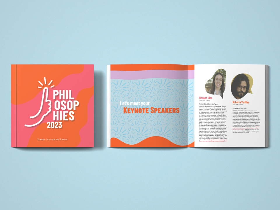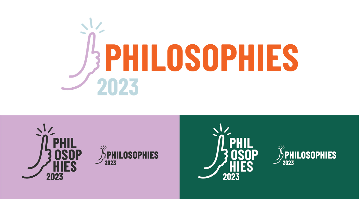 Event branding design for a fictional conference about design philosophies, entitled Philosophies 2023. This branding was created by a team of four of us; the other designers who worked on this project with me were Maya Givens, Bree Walton, and Alexis Jesse.