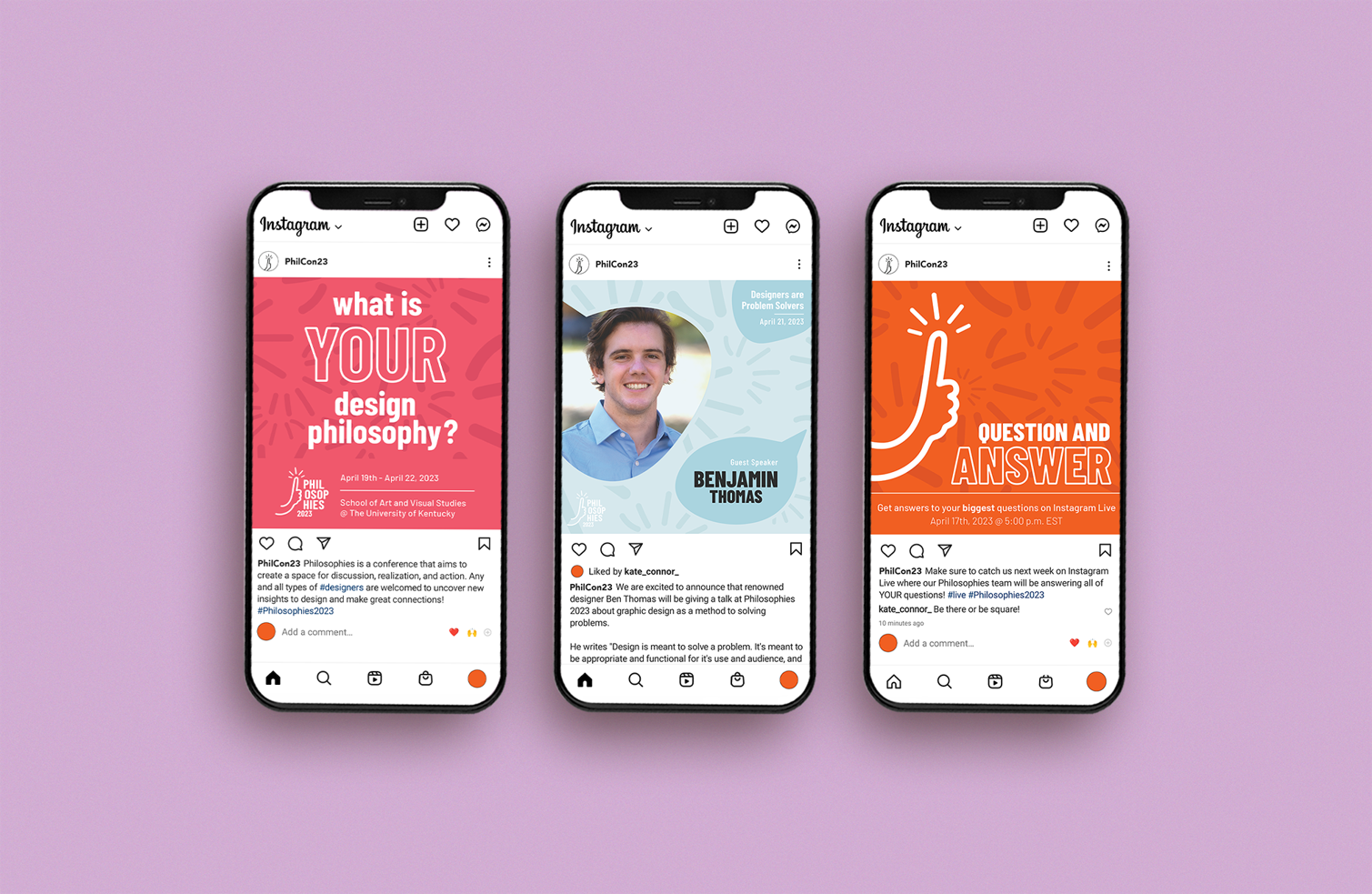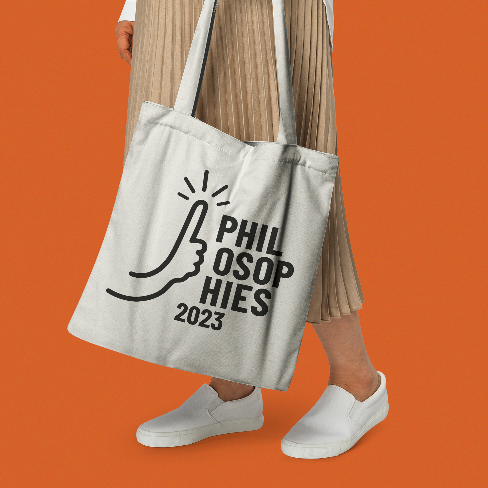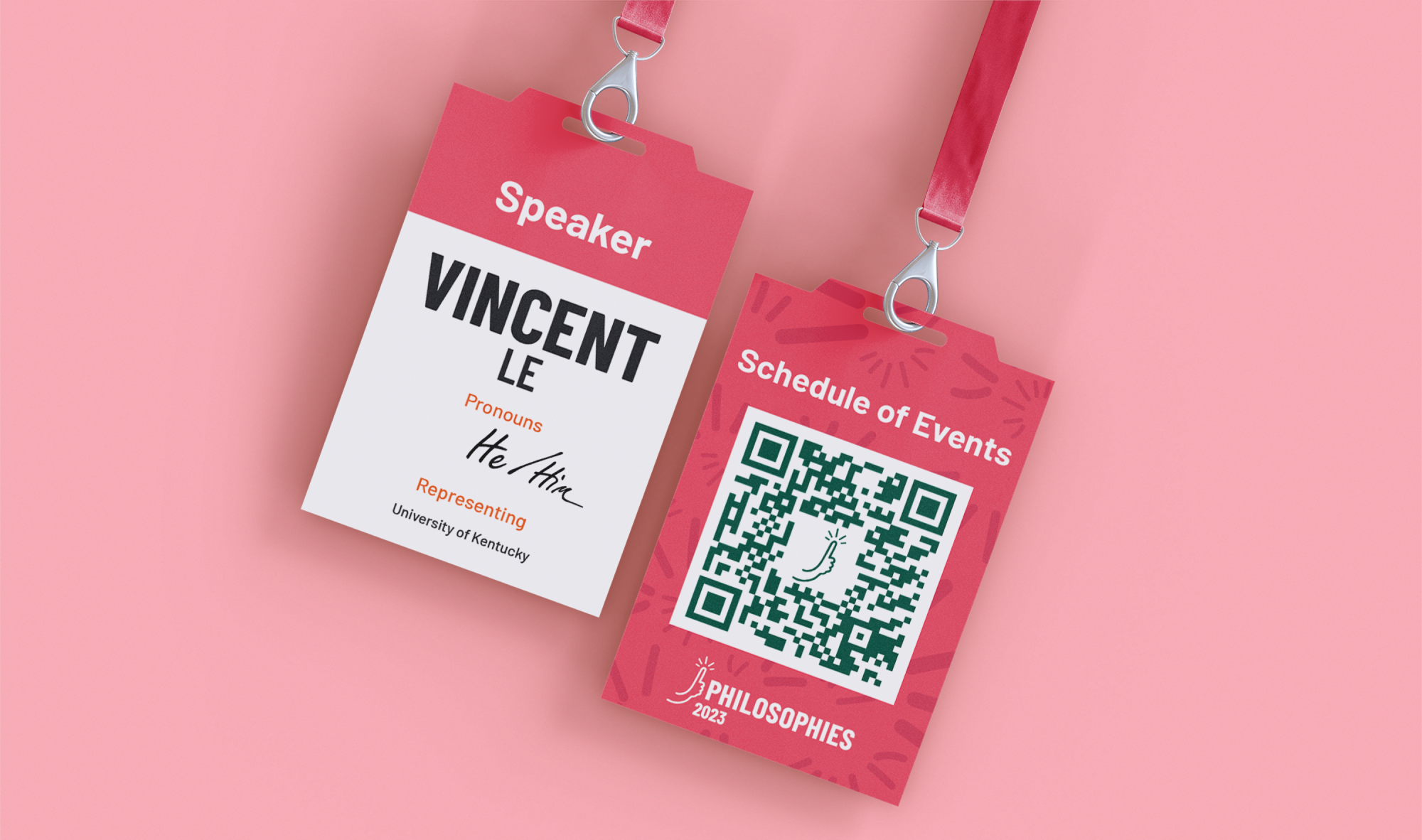 Event branding design for a fictional conference about design philosophies, entitled Philosophies 2023. This branding was created by a team of four of us; the other designers who worked on this project with me were Maya Givens, Bree Walton, and Alexis Jesse.