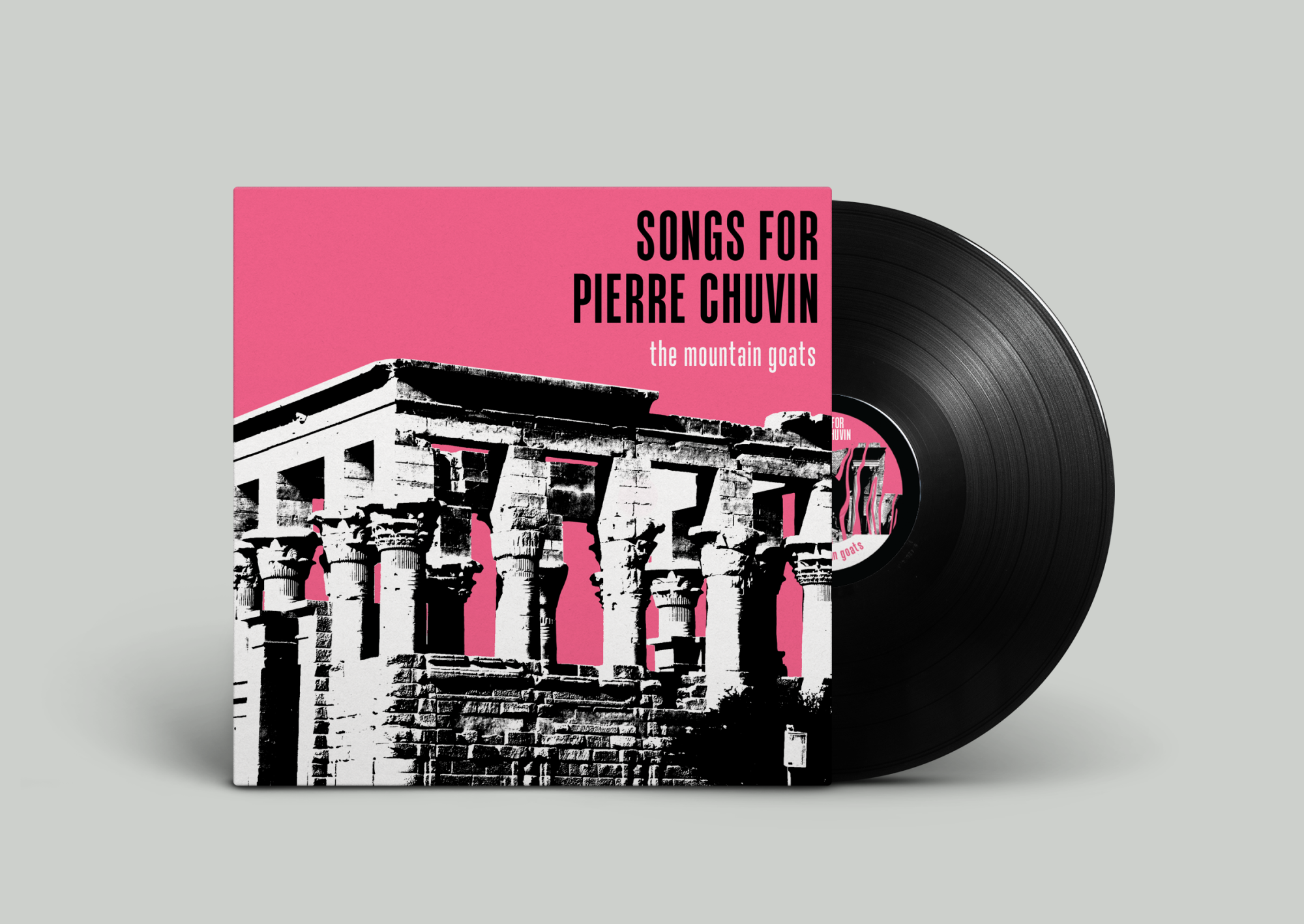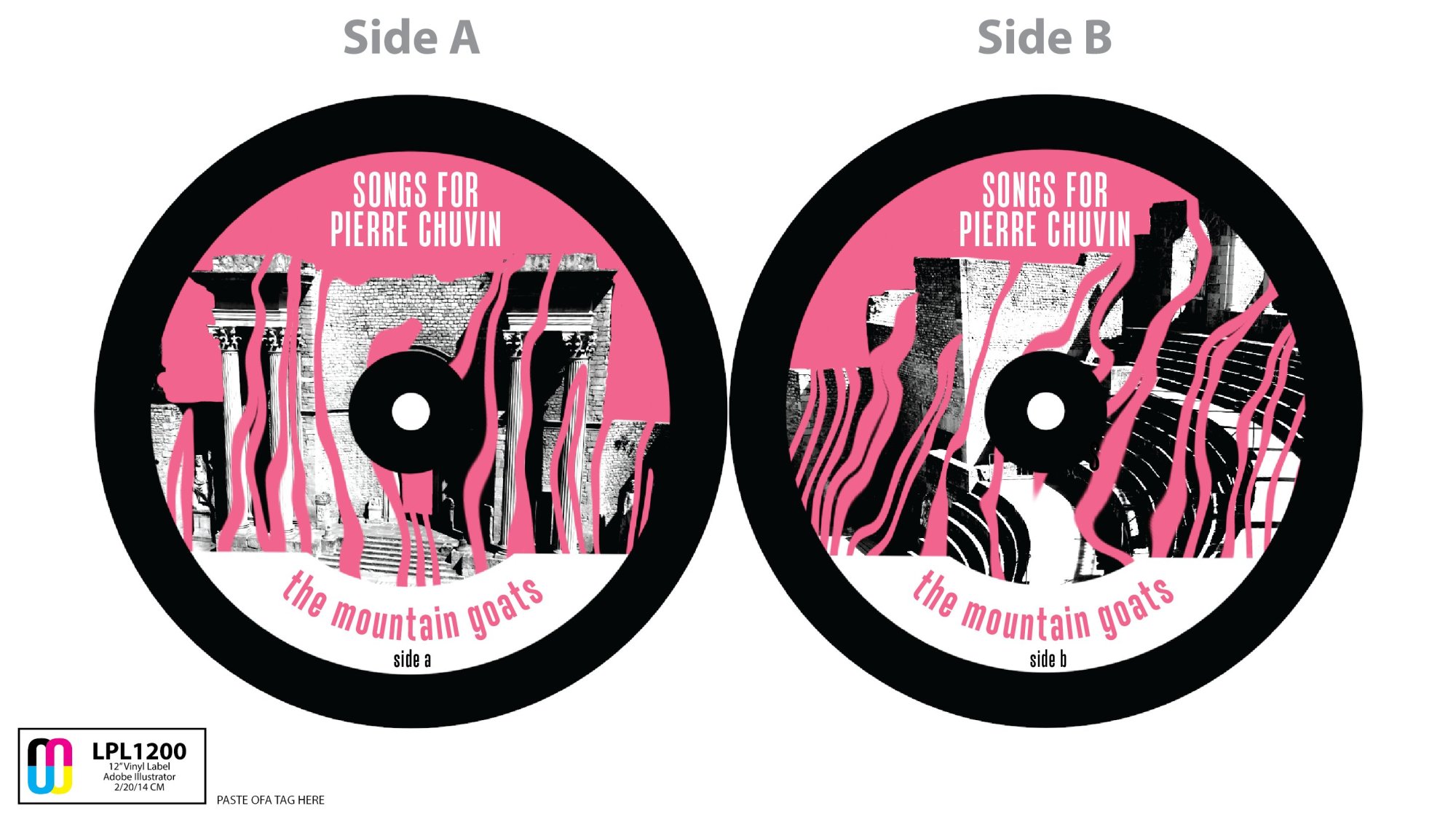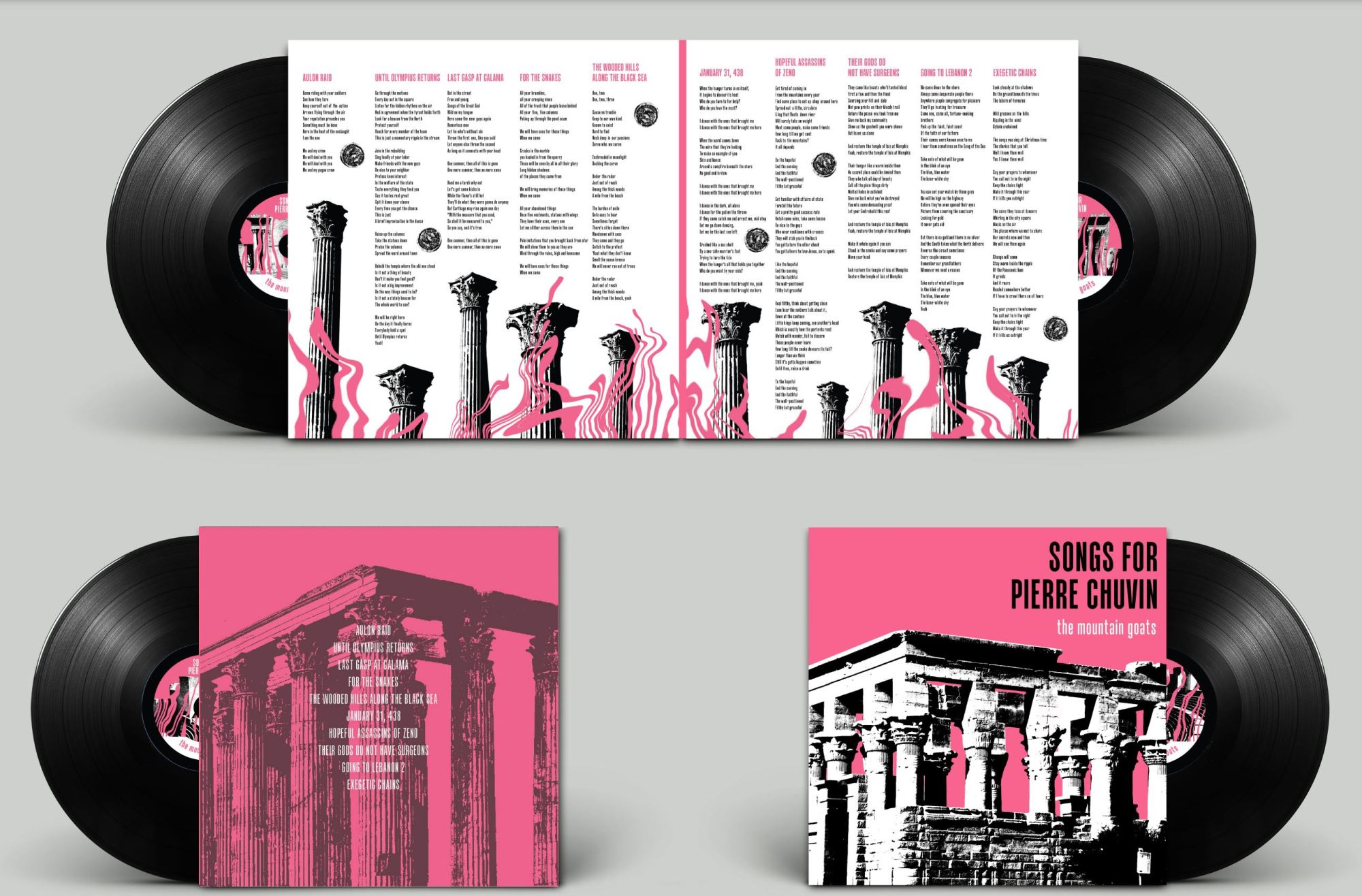 Songs For Pierre Chuvin Vinyl Speculative redesign for classwork of the album cover and vinyl record packaging for the album "Songs for Pierre Chuvin" by the Mountain Goats.