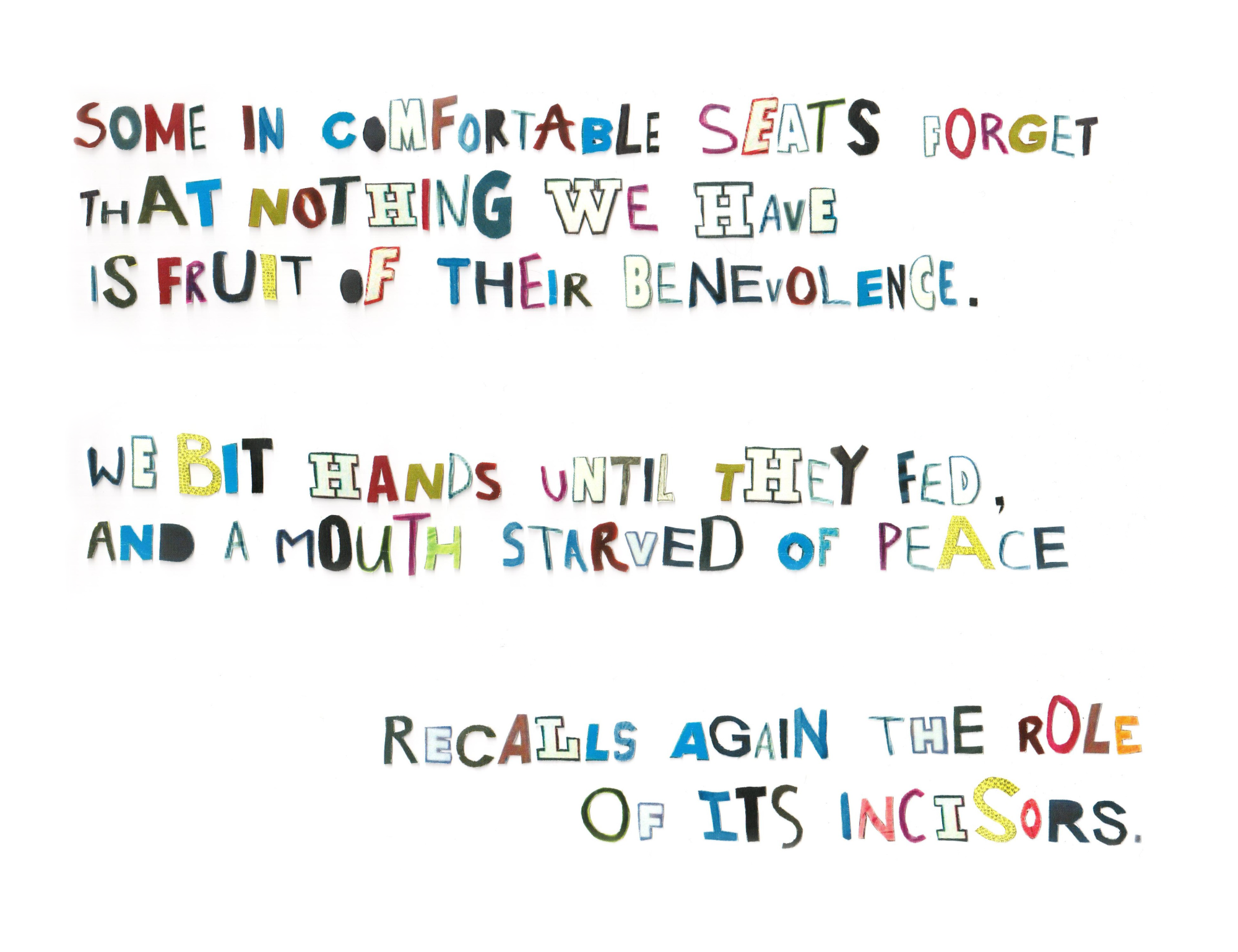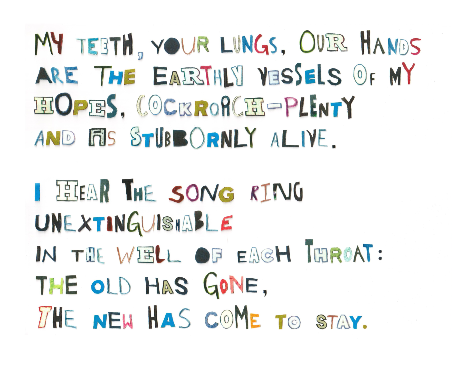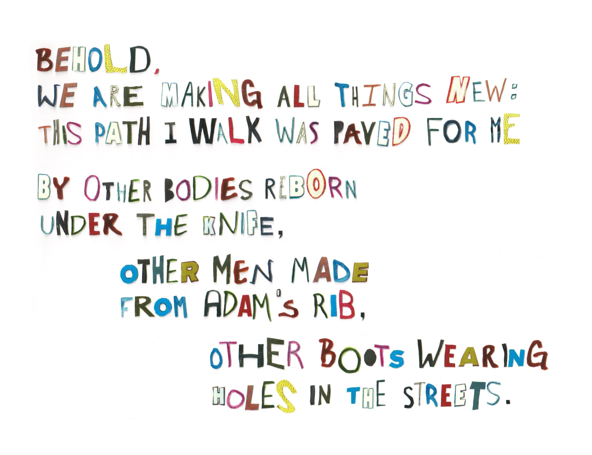 For this project, I cut out and collaged typography taken from pictures of protest signs at anti-transgender demonstrations. Each letter was cut out manually, and then arranged and scanned in page by page to form a poem I wrote about my experiences as a transgender person & hope for the future.